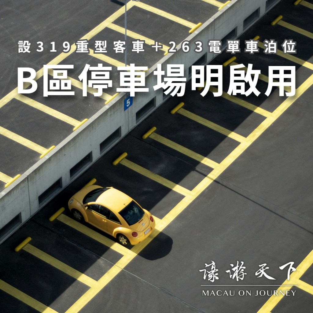 該停車場命名為「新城B區公共停車場」,將於4月9日投入使用。停車場出入口均設於孫逸仙大馬路,提供582個泊車位,包括319個重型客車泊車位及263個重型及輕型摩托車泊車位;採用封頂式收費,重型客車在每連續24小時內的泊車費用上限為澳門元60元、重型及輕型摩托車在每連續24小時內的泊車費用上限為澳門元10元;停車場准許泊車的時間上限為連續八日。同時,參考其他戶外的公共停車場實施「首15分鐘免費」和「半小時收費」模式,鼓勵車輛流轉。