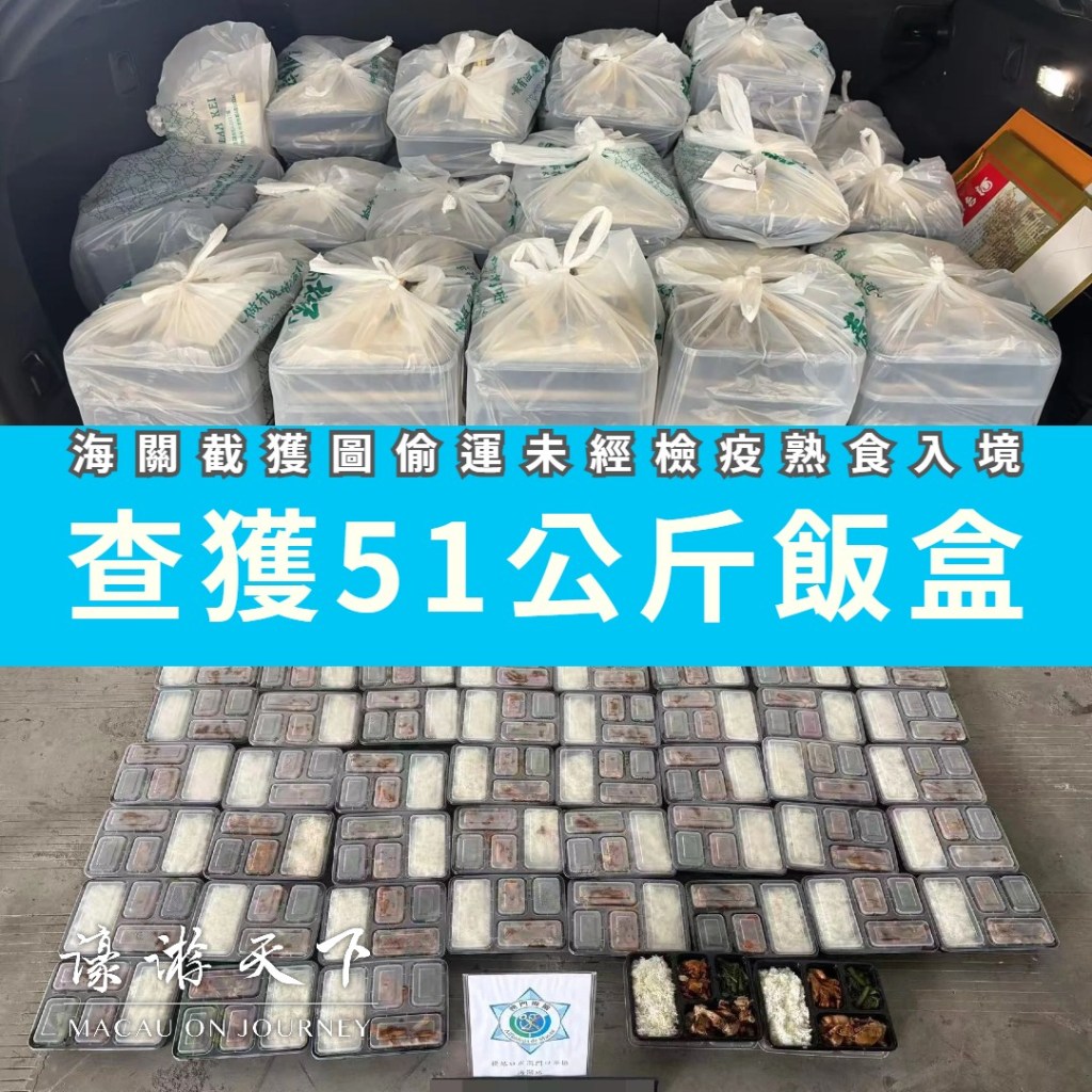 海關深夜公佈,上星期三於橫琴口岸截獲一宗企圖偷運未經檢疫熟食入境的個案,共檢約51公斤的熟食飯盒。海關透過「風險管理系統」的預警佈控,於橫琴口岸入境車道對一輛輕型客車進行截查,並在其車尾箱發現藏有約51公斤的熟食飯盒。