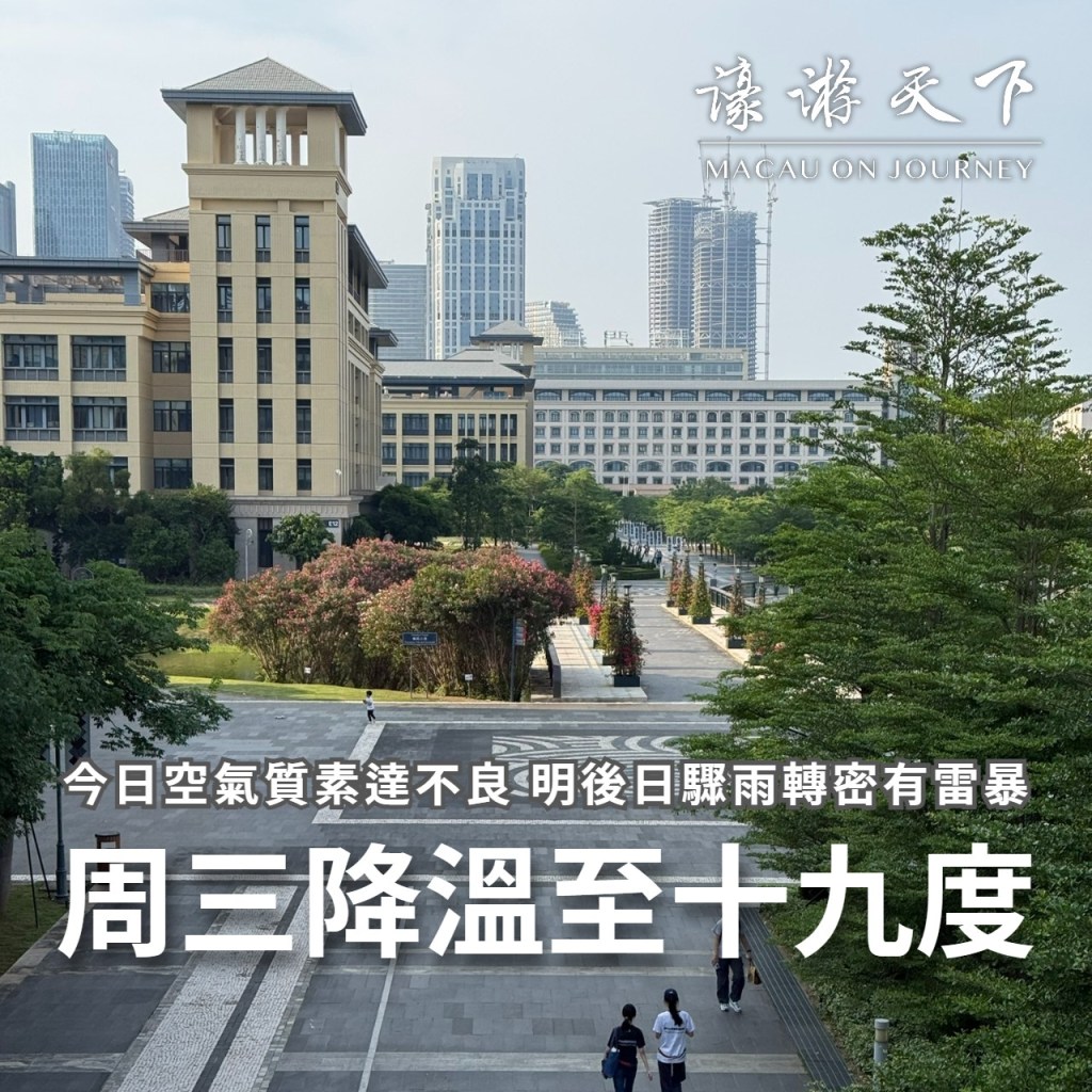 氣象局預料本澳今日空氣質素將達到不良水平,明後兩日驟雨轉為頻密及有雷暴,周三氣溫將降至十九度。