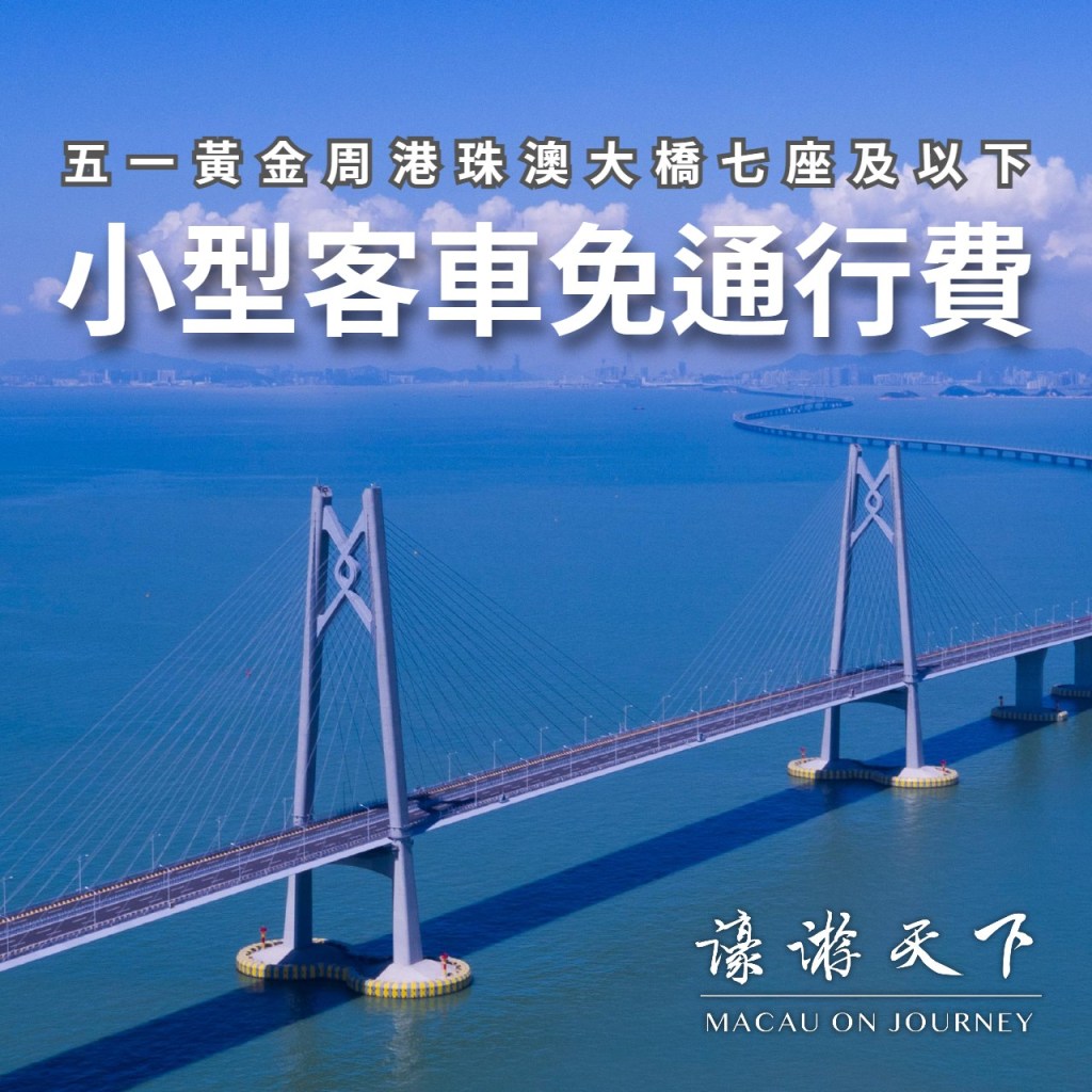 內地勞動節假期期間,港珠澳大橋七座及以下小型客車實施免費通行政策。當局預計,港珠澳大橋珠海公路口岸或將迎來車流、客流高峰,其中車輛入境高峰將由星期五下午五時開始。
