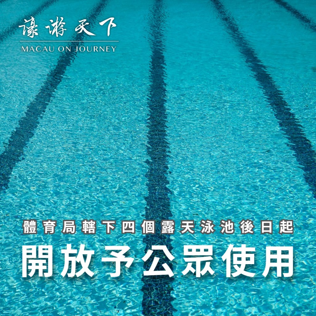 體育局轄下的四個露天泳池包括孫中山泳池、氹仔中央公園泳池、黑沙公園泳池及竹灣泳池將於5月1日起開放予公眾使用,每日分為三節開放,各個露天泳池具體開放時間可詳見附表。