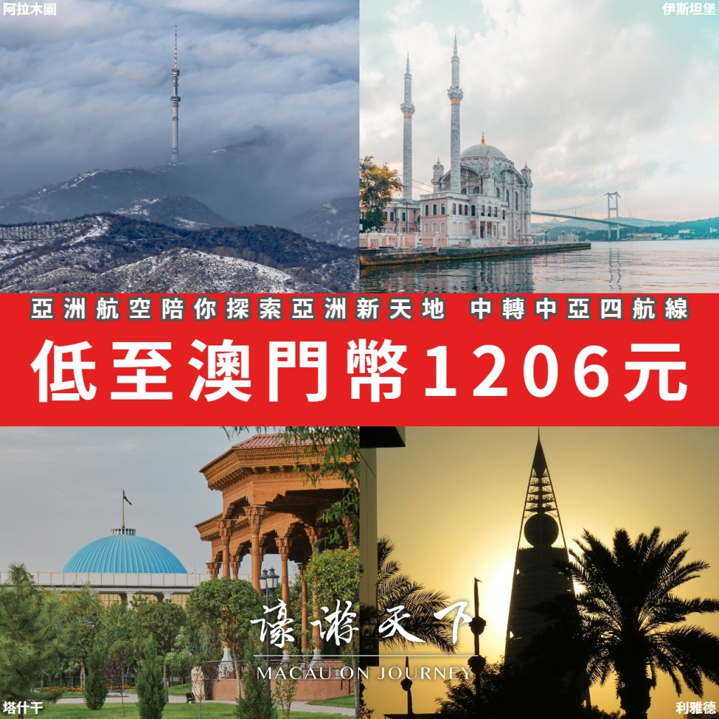 亞洲航空即日起推出優惠,陪你探索亞洲新天地!四條中亞地區航線,澳門出發低至澳門幣1206元。