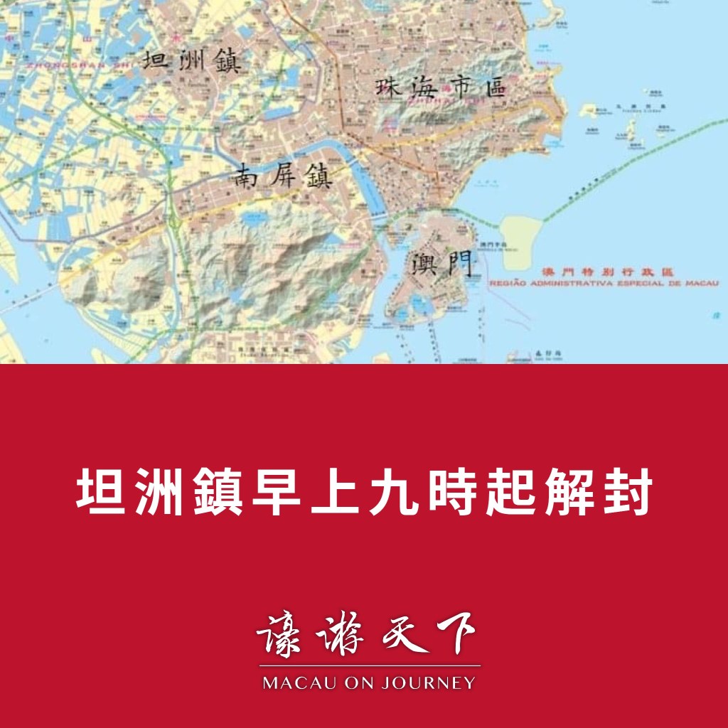 本澳新型冠狀病毒感染應變協調中心稍後宣佈,自今日上午11時起,取消對曾經到過坦洲鎮的人士,須按照衛生當局的要求在指定地點接受醫學觀察或健康碼變為黃碼及須接受自我健康管理的措施。