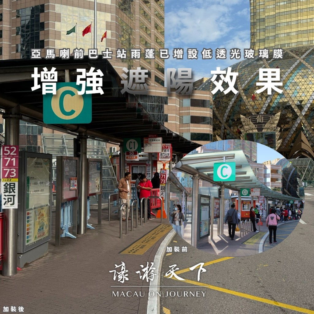 交通事務局回覆直選立法議員李良汪書面質詢時表示,近期已於亞馬喇前地巴士轉乘站雨篷上加設低透光玻璃膜,以增強遮陽效果,提升日間候車的舒適度。