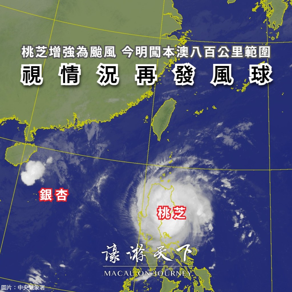 熱帶風暴桃芝已經升格為颱風。氣象局預料,今日後期至明日初時進入本澳八百公里範圍,局方將視乎情況考慮再次發出熱帶氣旋信號。