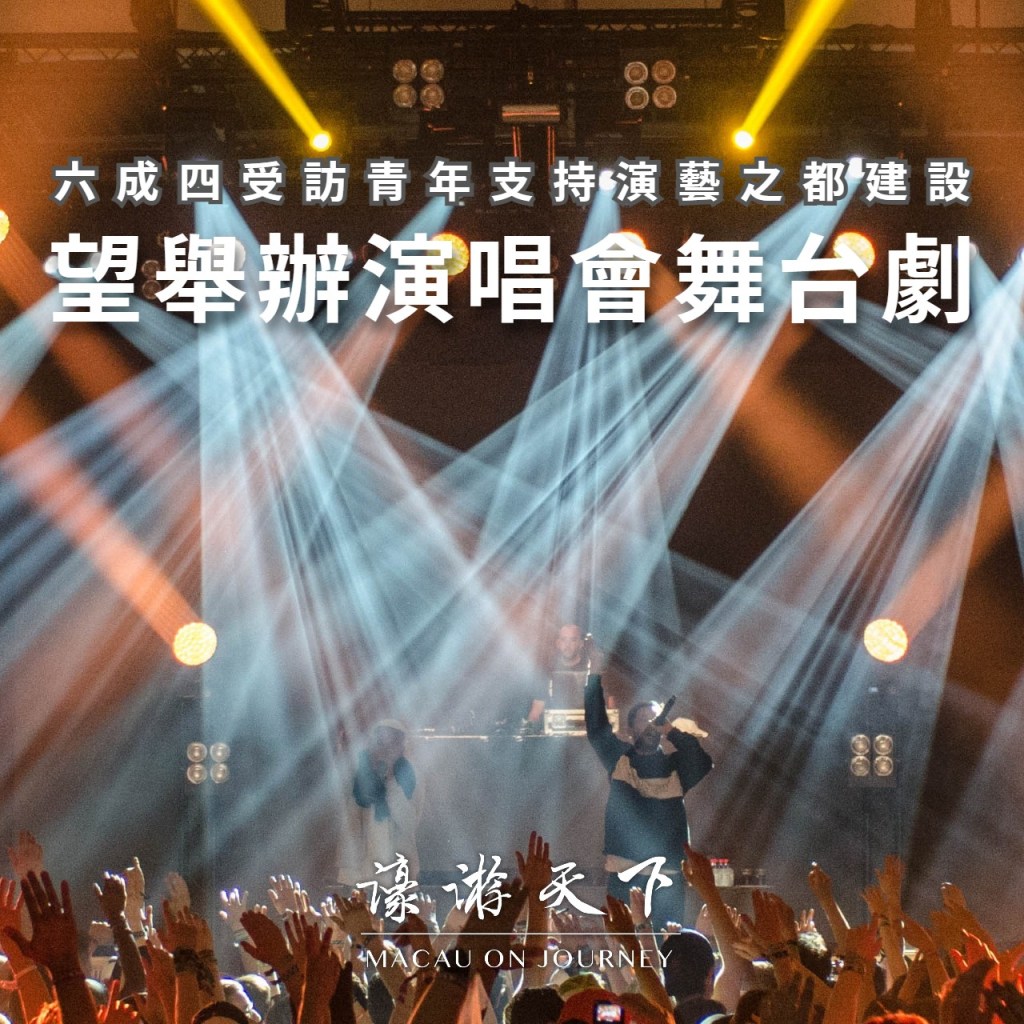 新青協調查顯示,六成四受訪青年支持本澳演藝之都建設。四成人最希望澳門未來舉辦更多國際巨星演唱會、一成半期望有更多高質素舞台劇或音樂劇。