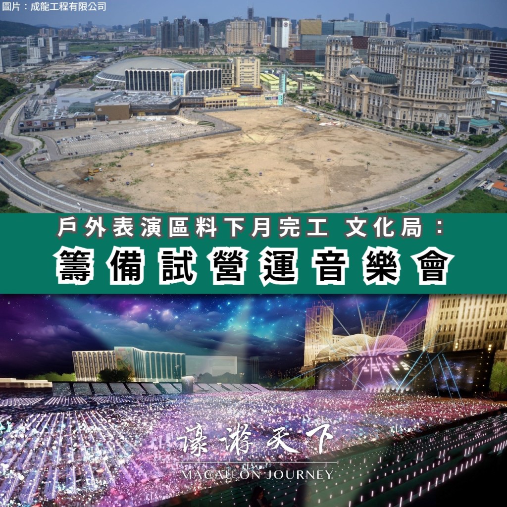 香港啟德體育園昨日舉行首場測試賽,而位於路氹可容納約五萬觀眾的戶外表演區預計下月完工。文化局局長梁惠敏表示,正籌備試營運音樂會。