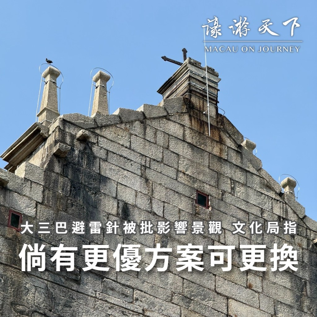 大三巴牌坊六月底安裝了避雷針,有市民反映影響景觀。身兼文化遺產委員會代主席的文化局局長梁惠敏指,現行方案可逆,未來若有更優方案可作更換。