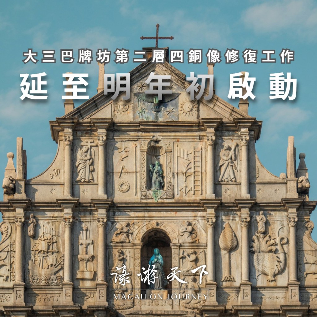 文化局局長梁惠敏透露,大三巴牌坊正在進行中的第二層銅像修復工作將延至明年初啟動,明年亦會逐步修復牌坊頂部白鴿與耶穌銅像。