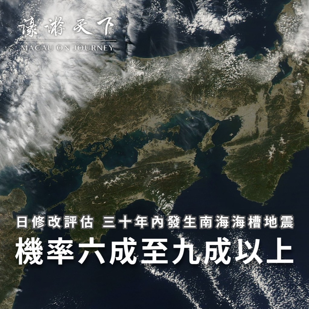 日本政府地震調查委員會星期五局部修訂了南海海槽地震「長期評估」,今後三十年以內的發生機率從之前的「約八成」改為「約六成至九成以上」。