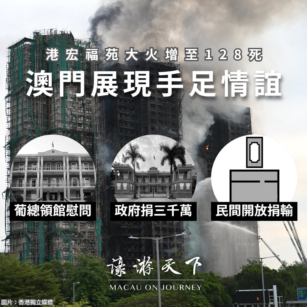 香港大埔宏福苑前日發生的大火,至下午增至128死。同屬特區的澳門,政府及民間陸續開展支援工作,展現手足情誼。