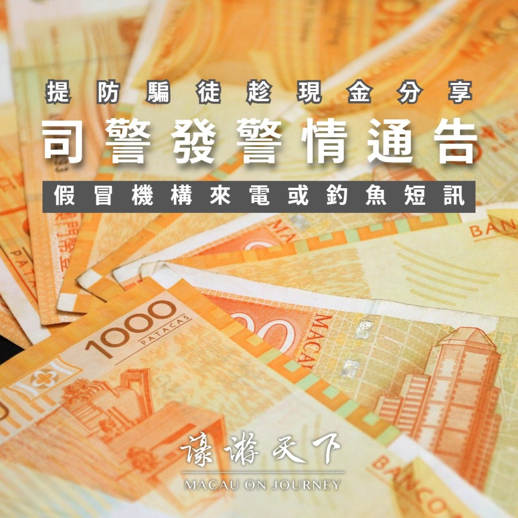 政府昨日公佈了本年度現金分享計畫的發放安排。司法警察局發出警情通告,提醒市民提防騙徒趁計畫假冒機構來電或濫發釣魚短訊。