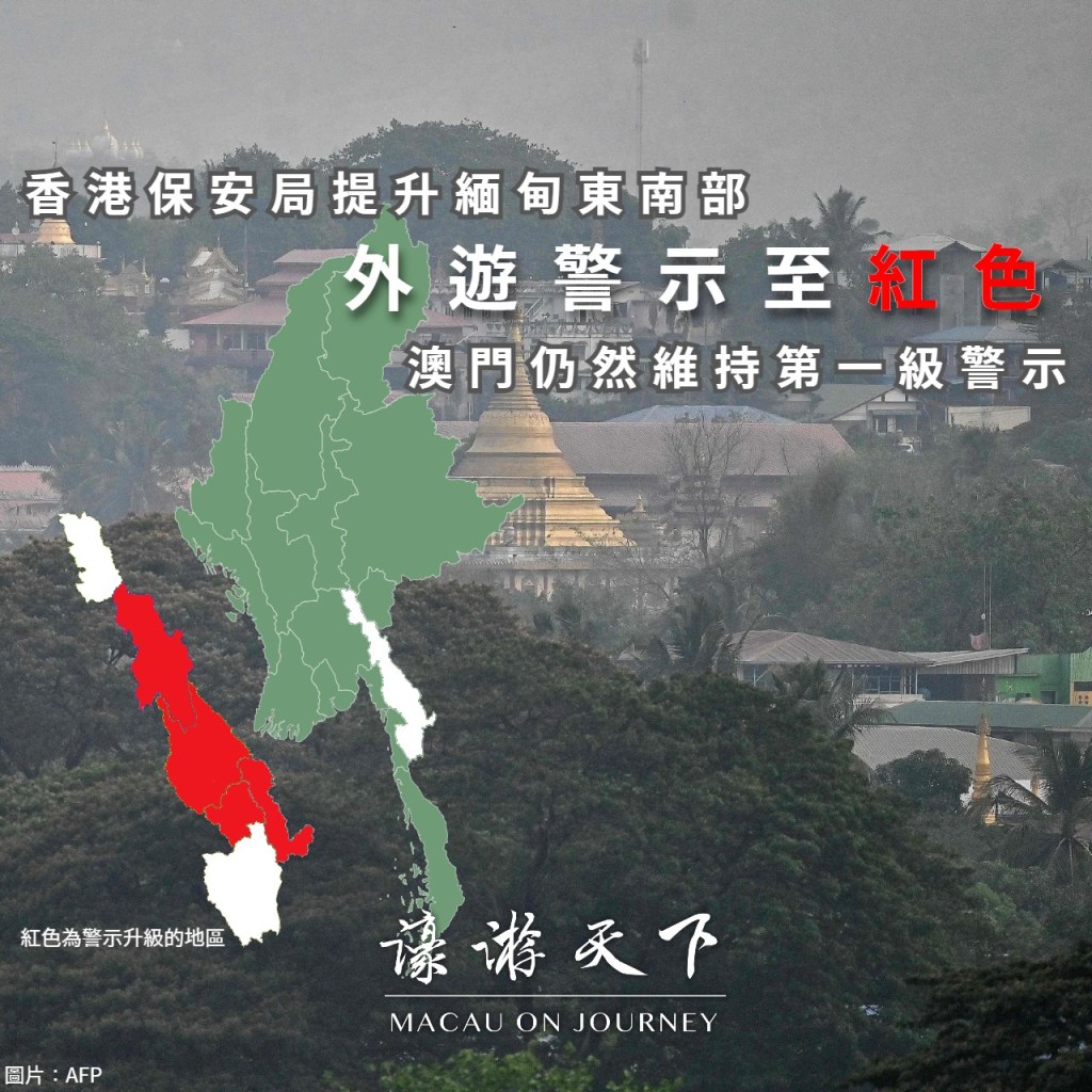 鑑於近期事態發展,香港特區政府昨日提升對緬甸東南部地區的外遊警示級別至紅色,而緬甸其他地區則維持黃色外遊警示。本澳目前對緬甸全國仍然維持最低的第一級警示。