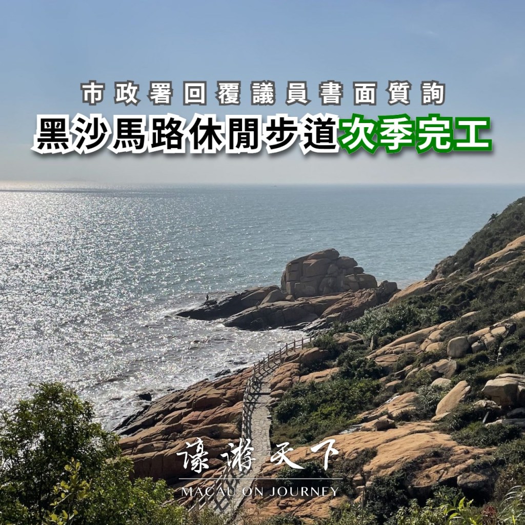 新上任的市政管理委員會主席周偉迎回覆間選立法議員李振宇書面質詢時透露,介乎於賈梅士大馬路至九澳高頂圓形地的黑沙馬路休閒步道,第二期及第三期預計今年第二季完工。