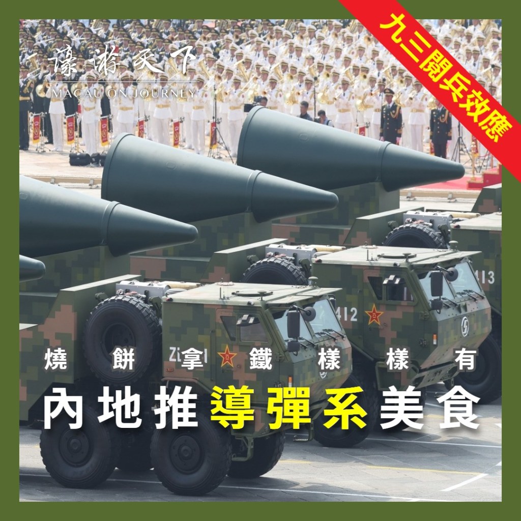 內地月初舉行了紀念抗戰勝利八十周年閱兵。除了早前提到的導彈抱枕外,內地餐飲業也響應閱兵熱潮,推出導彈系列美食。