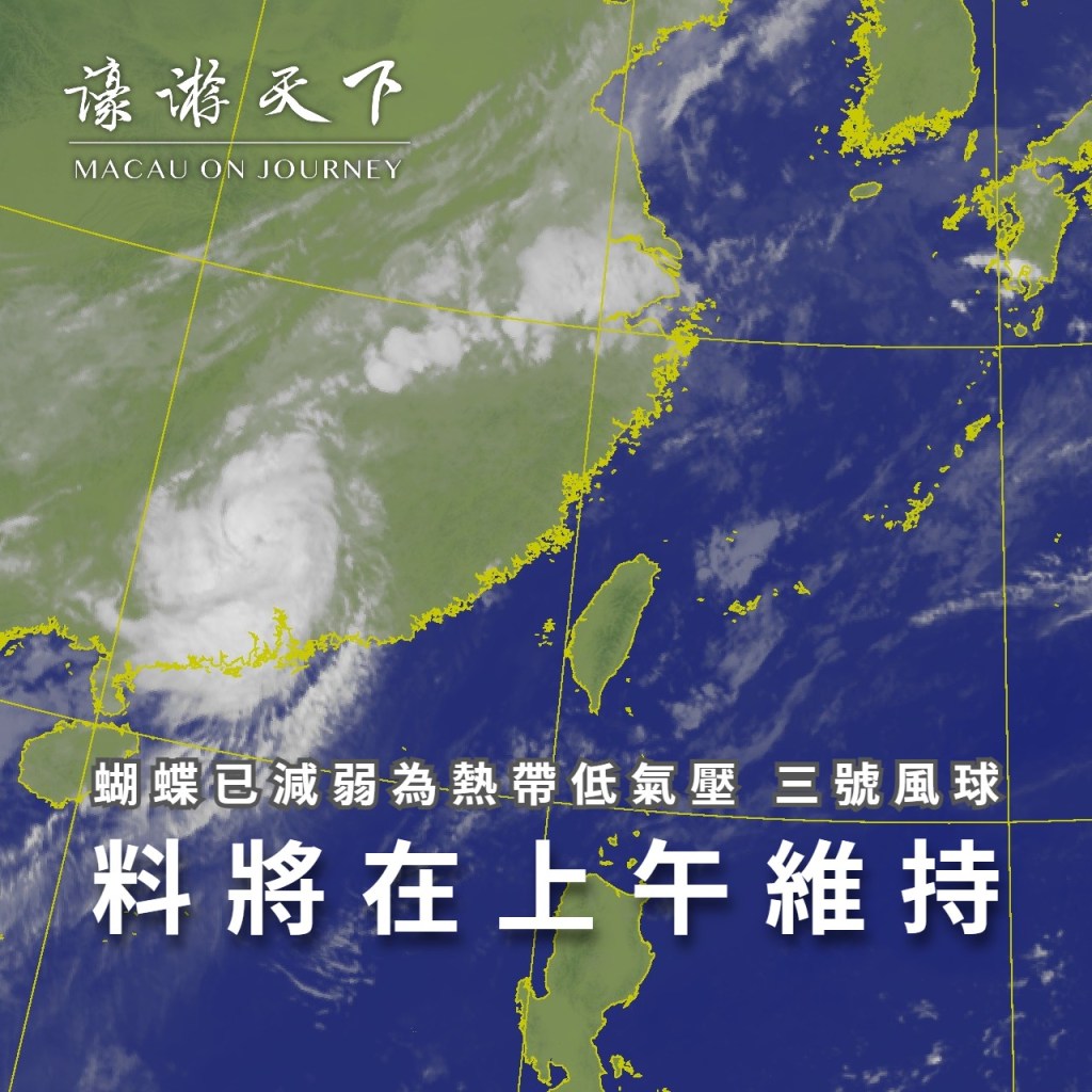 天氣, 澳門 蝴蝶已減弱為熱帶低氣壓 三號風球料將在上午維持 2025-06-15 濠遊天下 macauonjourney 發佈留言 受熱帶低氣壓蝴蝶影響,三號風球仍然生效。預料三號風球將在上午維持。 繼續閱讀 蝴蝶已減弱為熱帶低氣壓 三號風球料將在上午維持 →