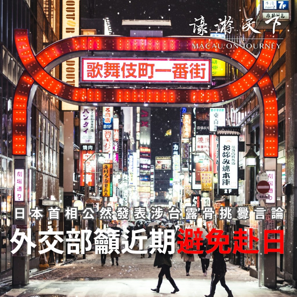 安全, 日本, 中國 日本首相公然發表涉台露骨挑釁言論 外交部籲近期避免赴日 2025-11-15 濠遊天下 macauonjourney 發佈留言 日本首相近日公然發表涉台露骨挑釁言論,引發中日新一輪外交風波。外交部及駐日使領館提醒中國公民近期避免前往日本。 繼續閱讀 日本首相公然發表涉台露骨挑釁言論 外交部籲近期避免赴日 →