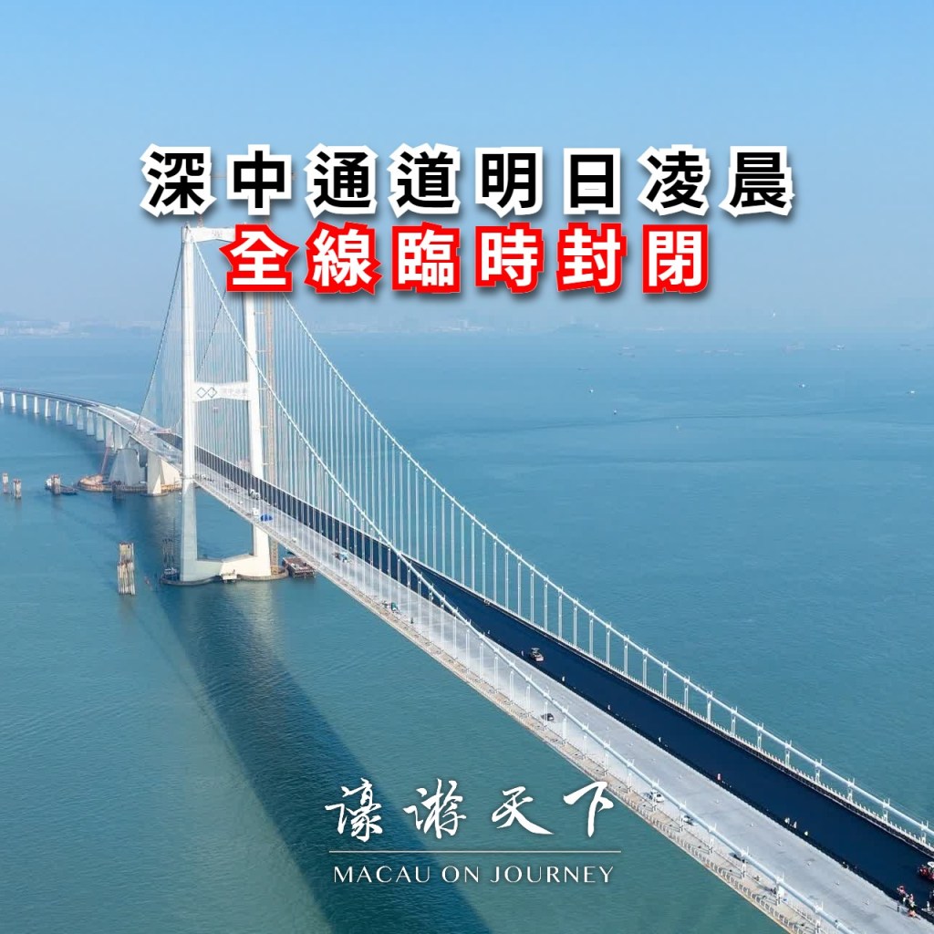 因舉行綜合應急演練,深中通道明日凌晨二時至五時,將全線雙向臨時封閉。