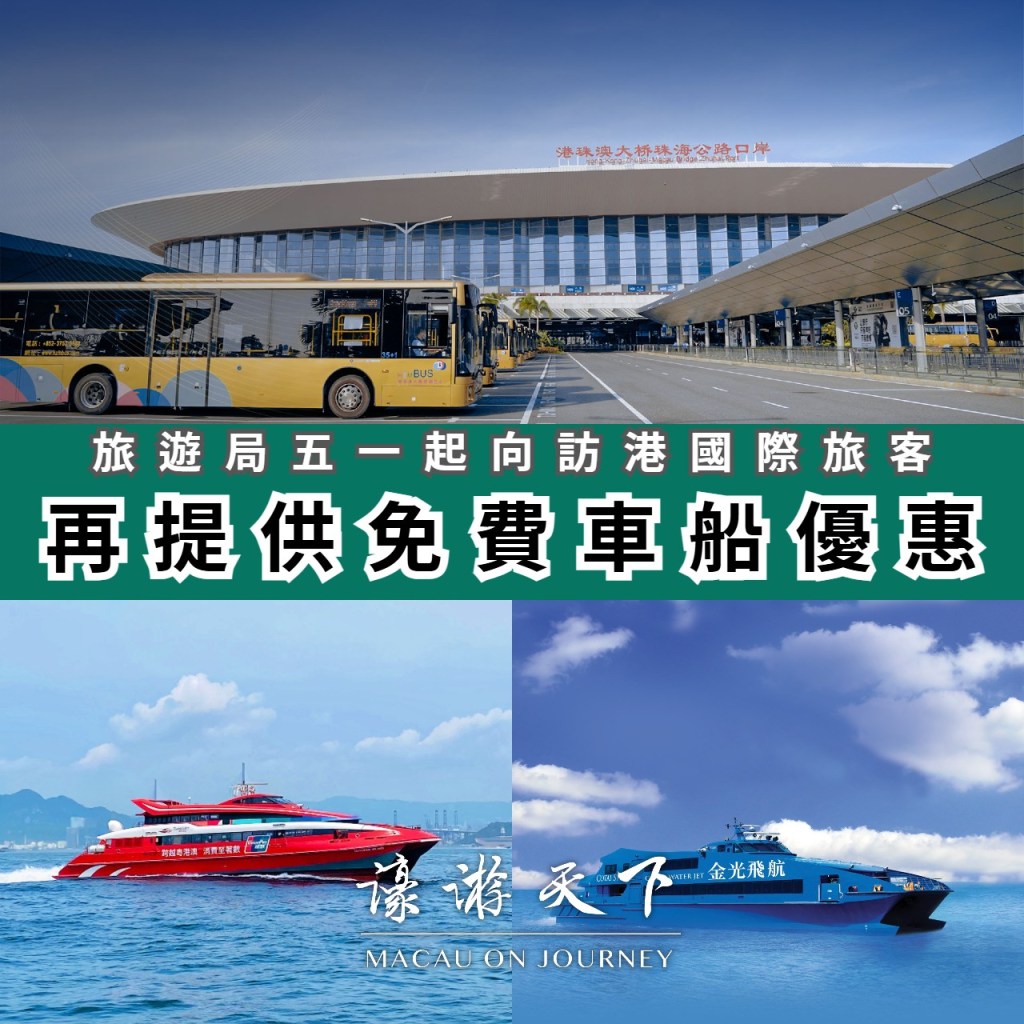 旅遊局宣佈於5月1日起繼續推出「免費直達巴士車票及船票」優惠,向到訪香港的國際旅客(大中華地區外)提供從香港往澳門的免費客車和客船優惠。優惠期至今年12月31日。
