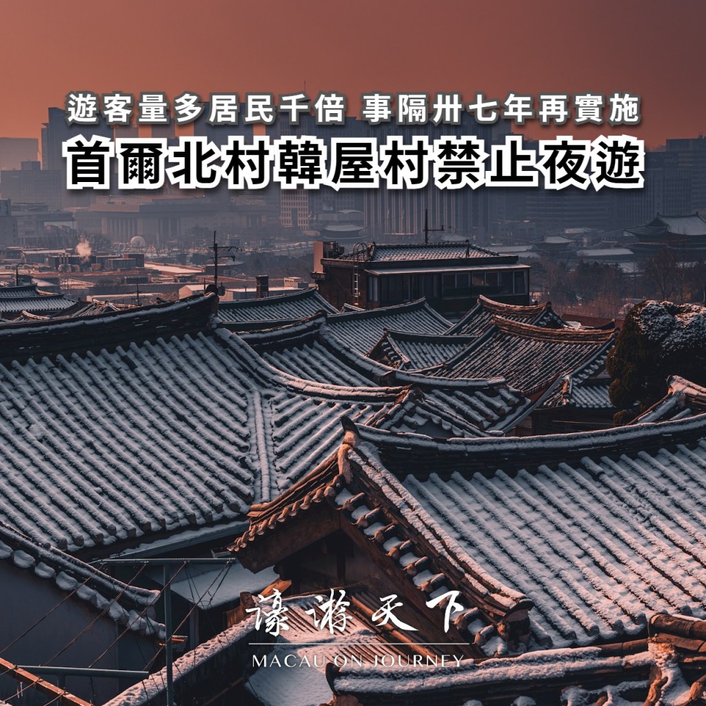 過度旅遊, 韓國 遊客量多居民千倍 事隔卅七年再實施 首爾北村韓屋村禁止夜遊 2024-07-04 濠遊天下 macauonjourney 發佈留言 近年過度旅遊的問題在全球各地蔓延,最新加入的有韓國首爾。市內著名的北村韓屋村所在的鐘路區政府星期一宣佈,計劃在十月起禁止遊客在夜間到訪管制區。 繼續閱讀 遊客量多居民千倍 事隔卅七年再實施 首爾北村韓屋村禁止夜遊 →