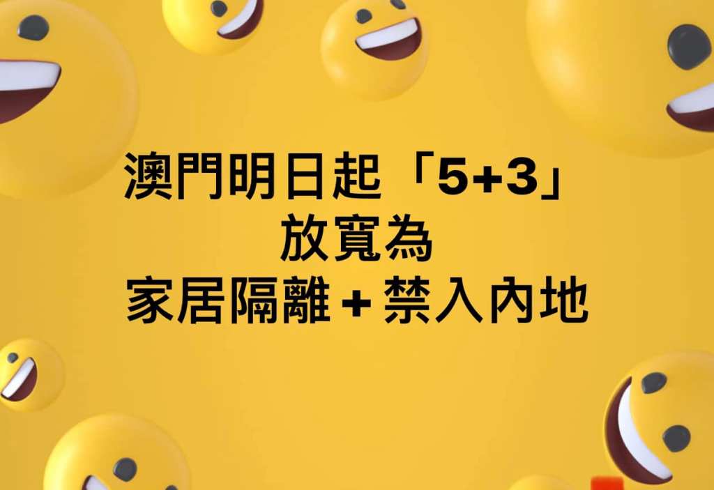 本澳明日起進一步放寬香港、台灣及海外入境人士的隔離要求。「5+3」措施由目前的五日集中集中隔離醫學觀察及三日居家隔離醫學觀察,改為五日居家隔離醫學觀察及三日離境限制。