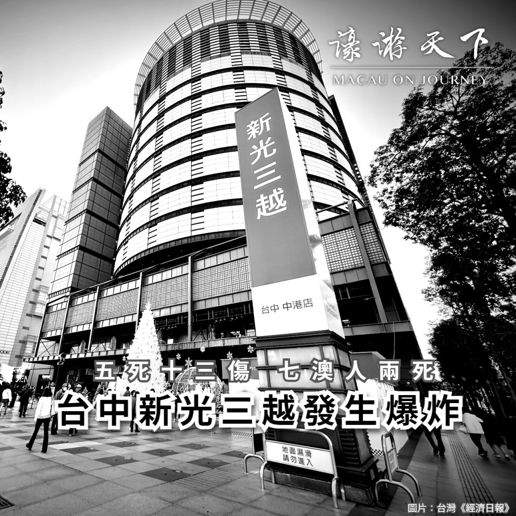 台中新光三越百貨早上11時33分發生懷疑氣體爆炸,目前已知有五人死亡、十三人傷。事發現場有七名澳門人,其中兩人不幸遇難。