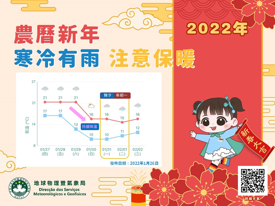 【1/28更新】預料一道冷鋒將於週六晚間抵達廣東沿岸,隨後受強烈冬季季風影響,氣溫將顯著下降,北風增強。週日至週一除夕最低氣溫將下降至10度左右。展望農曆新年期間冬季季風將持續影響本澳,最低氣溫維持12度或以下。由於伴隨多雲有雨的天氣,寒冷的感覺會更為明顯,請市民留意天氣變化,注意保暖。