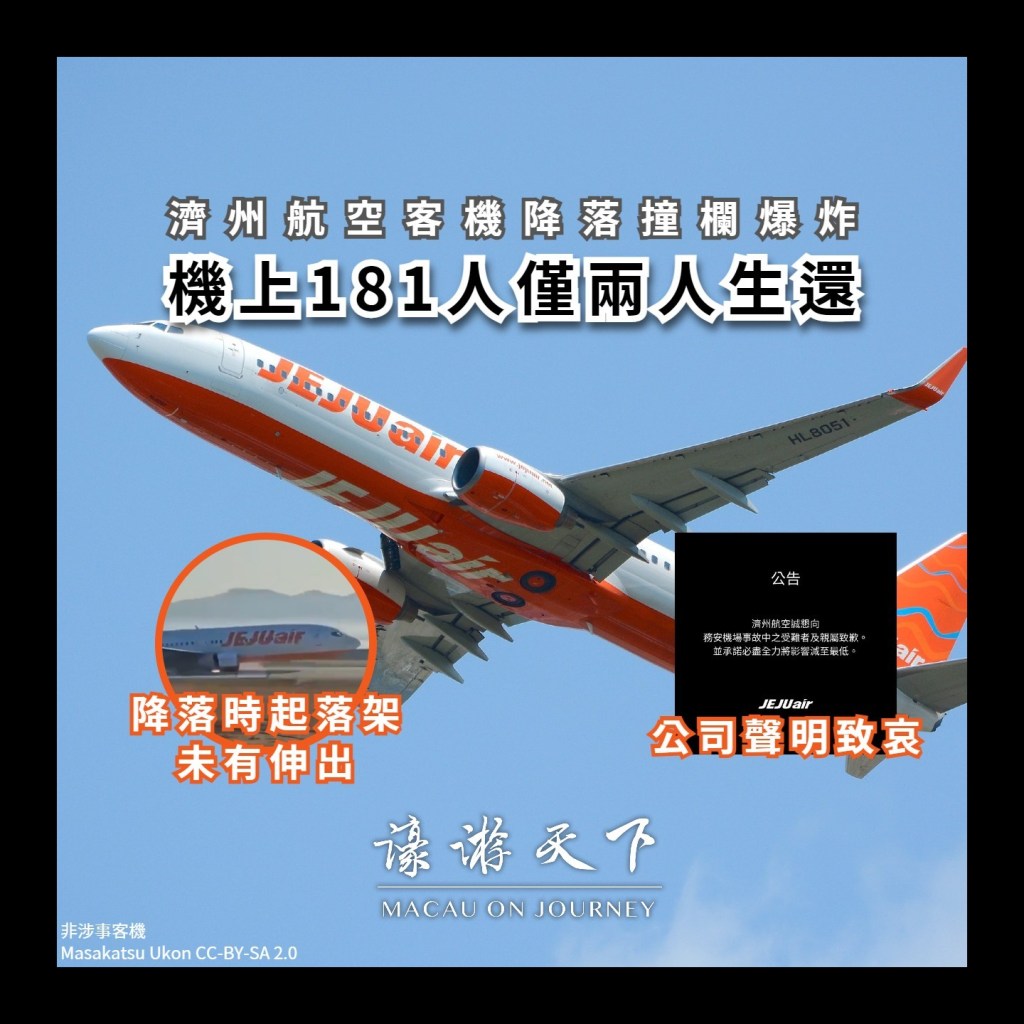 韓國低成本航空公司濟州航空上午發出成立十九年最嚴重事故。一架由曼谷返抵務安機場的波音737-800客機降落時撞上跑道外牆,隨即爆炸起火。至今機上181人只有兩人生還,177人證實罹難。