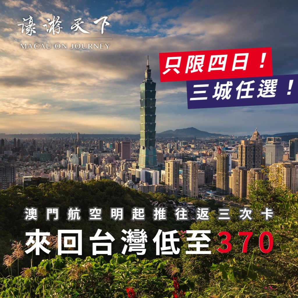 澳門航空明日起推出澳門出發往返台灣三次卡,飛往台灣來回低至澳門幣370元!