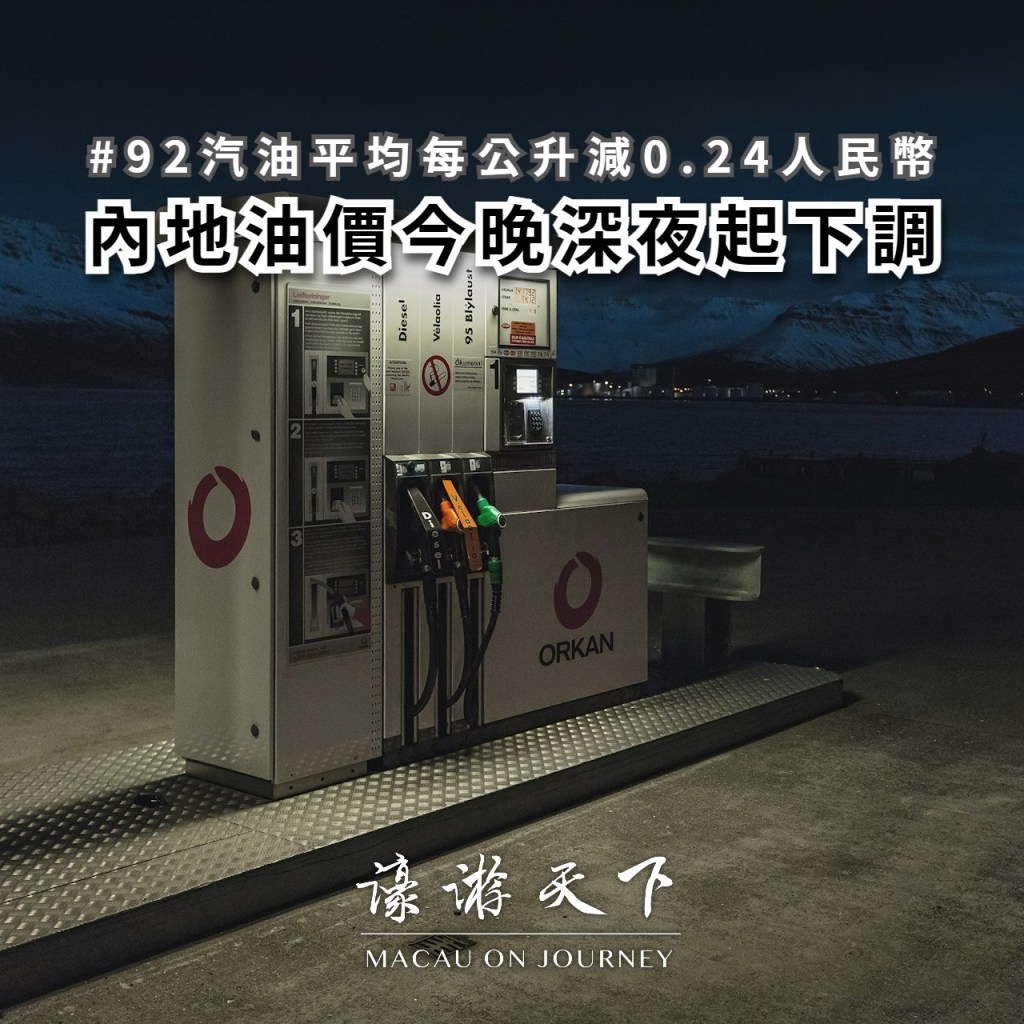 各位有北上加油習慣的朋友先等等!內地今日深夜零時起減油價。全國平均92號汽油每公升下調0.24元。