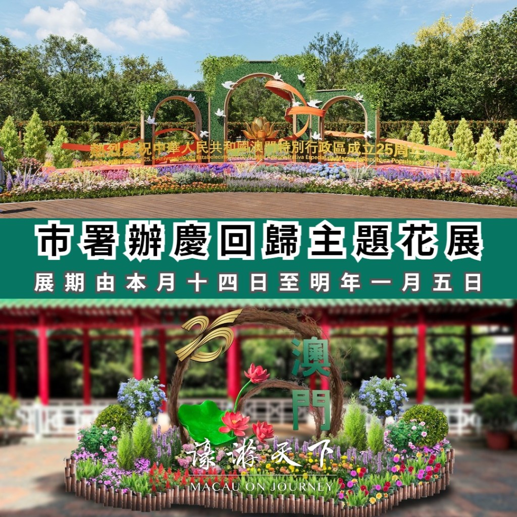 為慶祝澳門回歸祖國二十五周年,市政署將於氹仔龍環葡韻設主題花展,展期由本月14日至明年1月5日,期間亦會在全澳多處擺放節慶花壇,歡迎市民前往觀賞並感受節日氣氛。