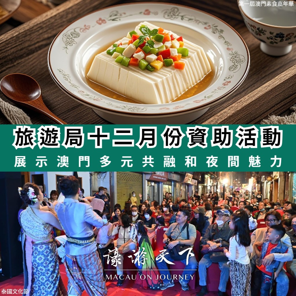 旅遊局於十二月份資助社團舉辦活動,包括「第一屆澳門素食嘉年華」、「2024泰國文化節」和「2024幻彩夜關前」,向居民和旅客展示澳門的多元共融和夜間魅力。
