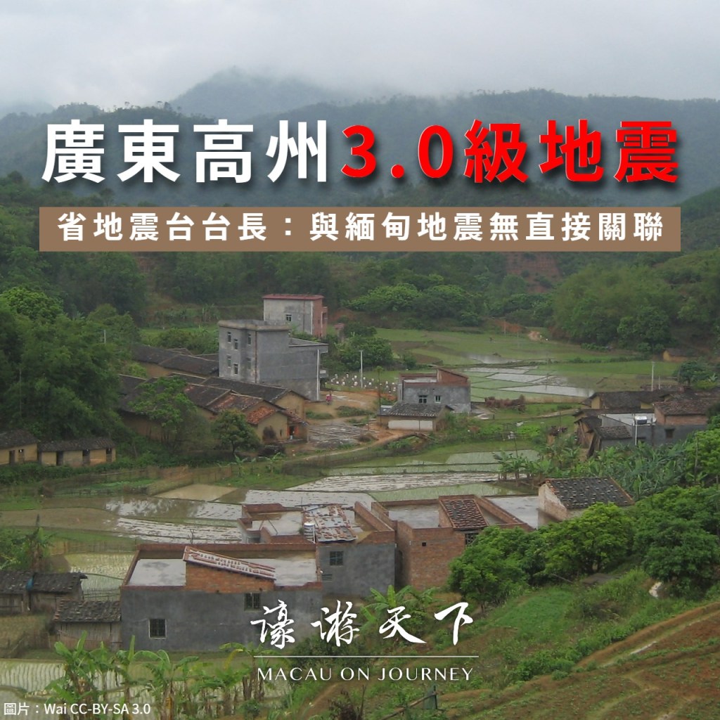 廣東茂名市高州市晚上發生黎克特制3.0級地震。廣東省地震局研判後認為,原震區近幾日發生五級以上地震的可能性不大。廣東省地震台台長王力偉表示,是次地震與緬甸地震無直接關聯。