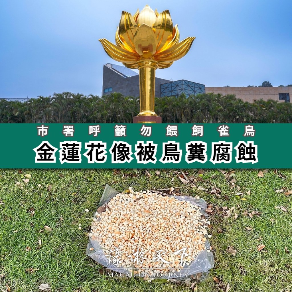 座落於金蓮花廣場的《盛世蓮花》雕塑部份飾面被鳥糞腐蝕。市政署呼籲市民及遊客切勿餵飼雀鳥。