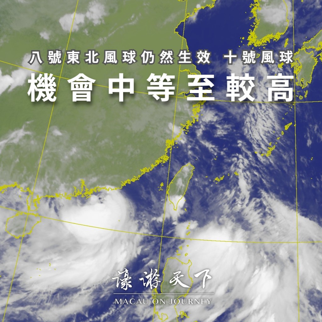 受颱風韋帕影響,八號東北風球仍然生效。預料八號風球將維持一段時間。預測本澳風力將會增強。根據機率圖,發出十號風球可能性中等至較高。