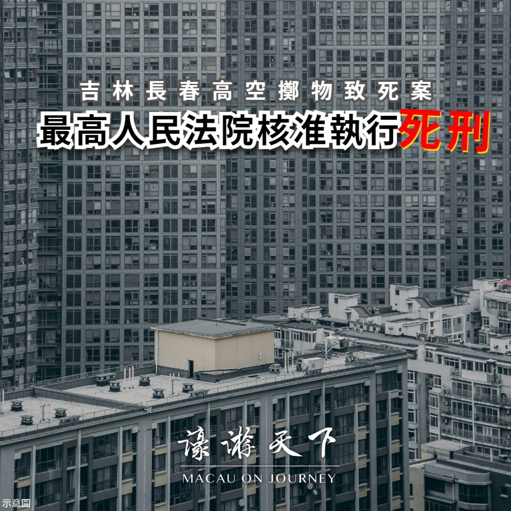 安全, 法律, 中國內地 吉林長春高空擲物致死案 最高人民法院核准執行死刑 2024-10-22 濠遊天下 macauonjourney 發佈留言 在內地高空擲物可以處以死刑!內地最高人民法院昨日核准了去年一宗高空擲物致死案的被告人死刑。犯人亦已於當日執行死刑。 繼續閱讀 吉林長春高空擲物致死案 最高人民法院核准執行死刑 →